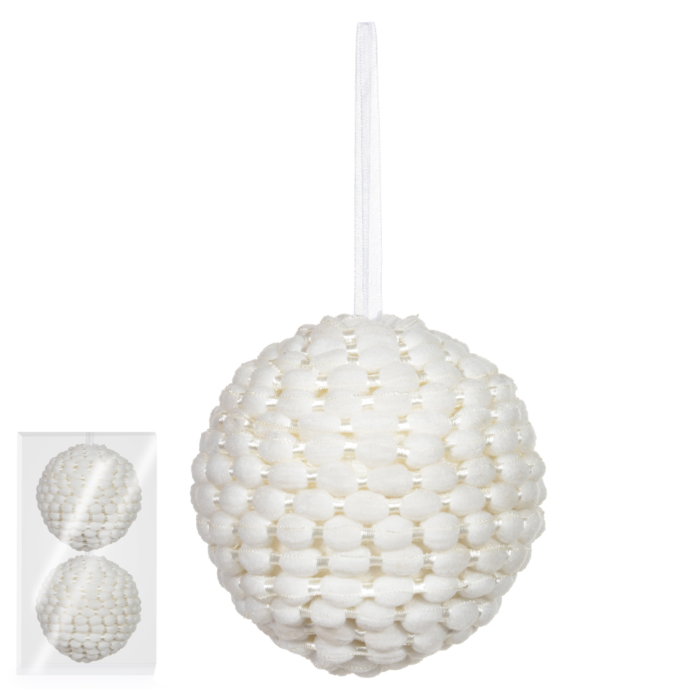 Decore sua árvore e espaços natalinos com elegância usando este kit com 2 bolas decoradas na cor branca, feitas em PVC resistente e leve. Com 10 cm de diâmetro, são ideais para destacar sua decoração com um toque clássico e clean.