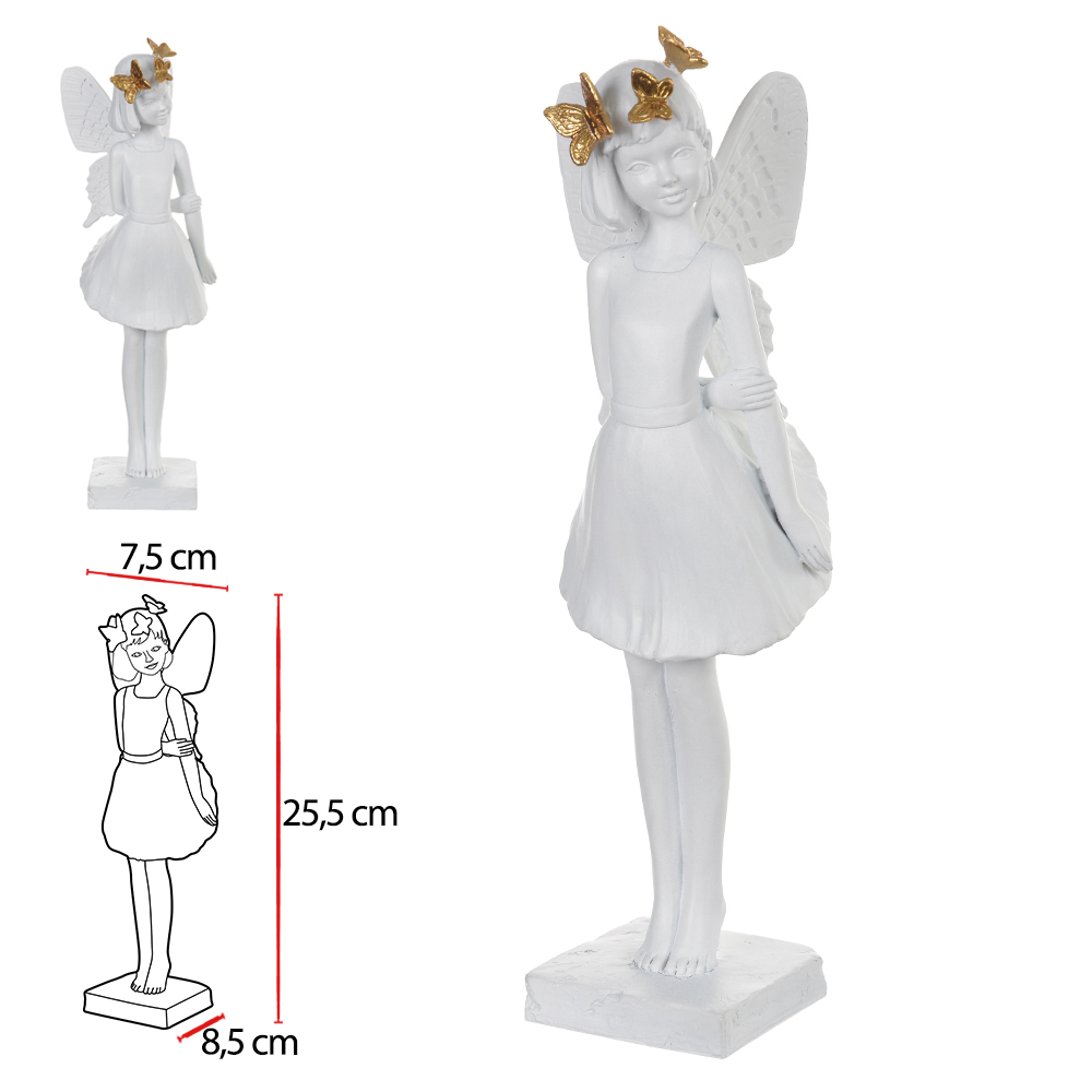 Enriqueça seu ambiente com esta graciosa escultura de fada em poliresina, com acabamento branco e detalhes dourados que trazem elegância e magia para qualquer espaço. Com medidas de 25,5cm de altura, 7,5cm de largura e 8,5cm de profundidade, é ideal para decorar prateleiras, aparadores ou mesas, oferecendo um toque suave e sofisticado.