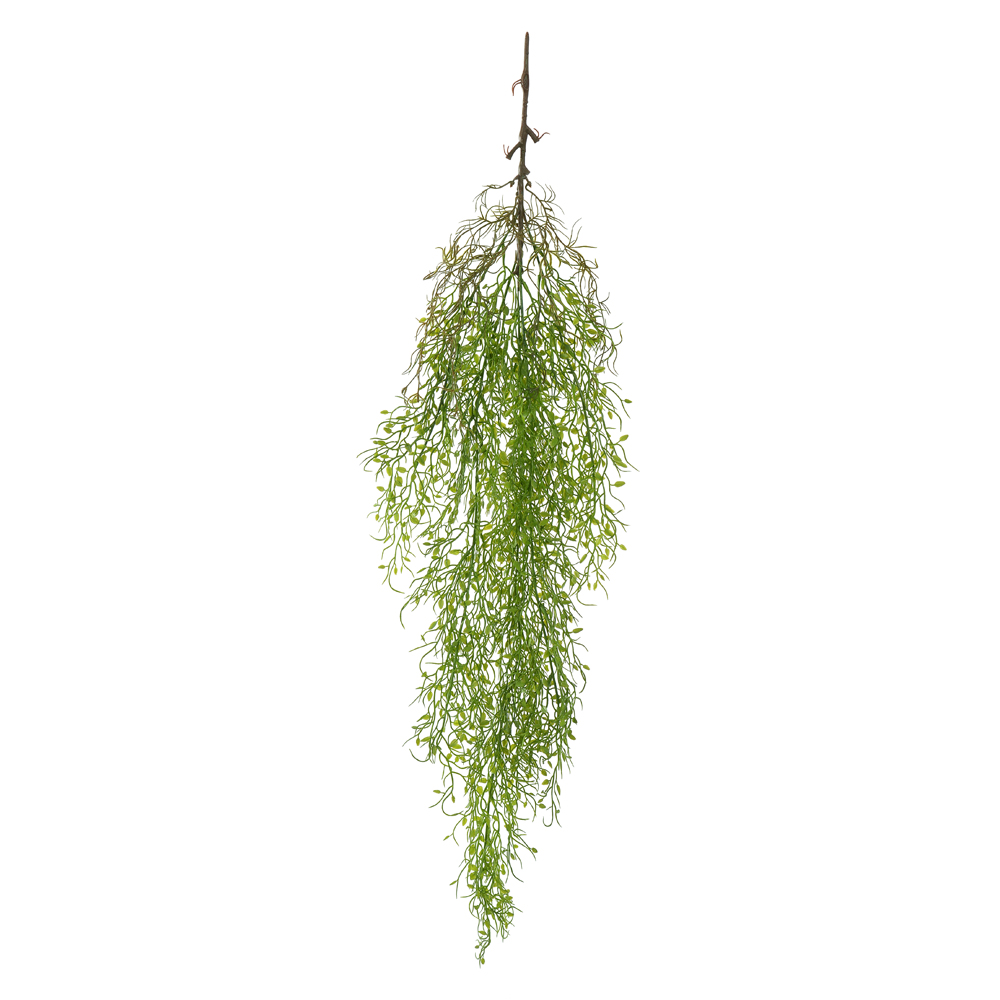 Folhagem artificial tipo gramínea pendente, com 82 hastes com impressão realista em plástico verde, perfeita para decorações verticais, vasos suspensos ou composição com outras plantas artificiais.