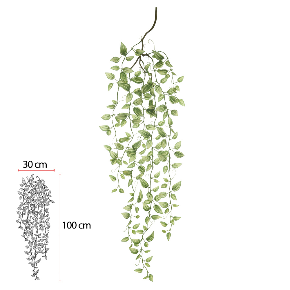 Folhagem artificial do tipo pendente, com 190 folhas no total, em tonalidade verde com creme, ideal para dar um toque natural e delicado à decoração de prateleiras, vasos suspensos ou jardineiras.