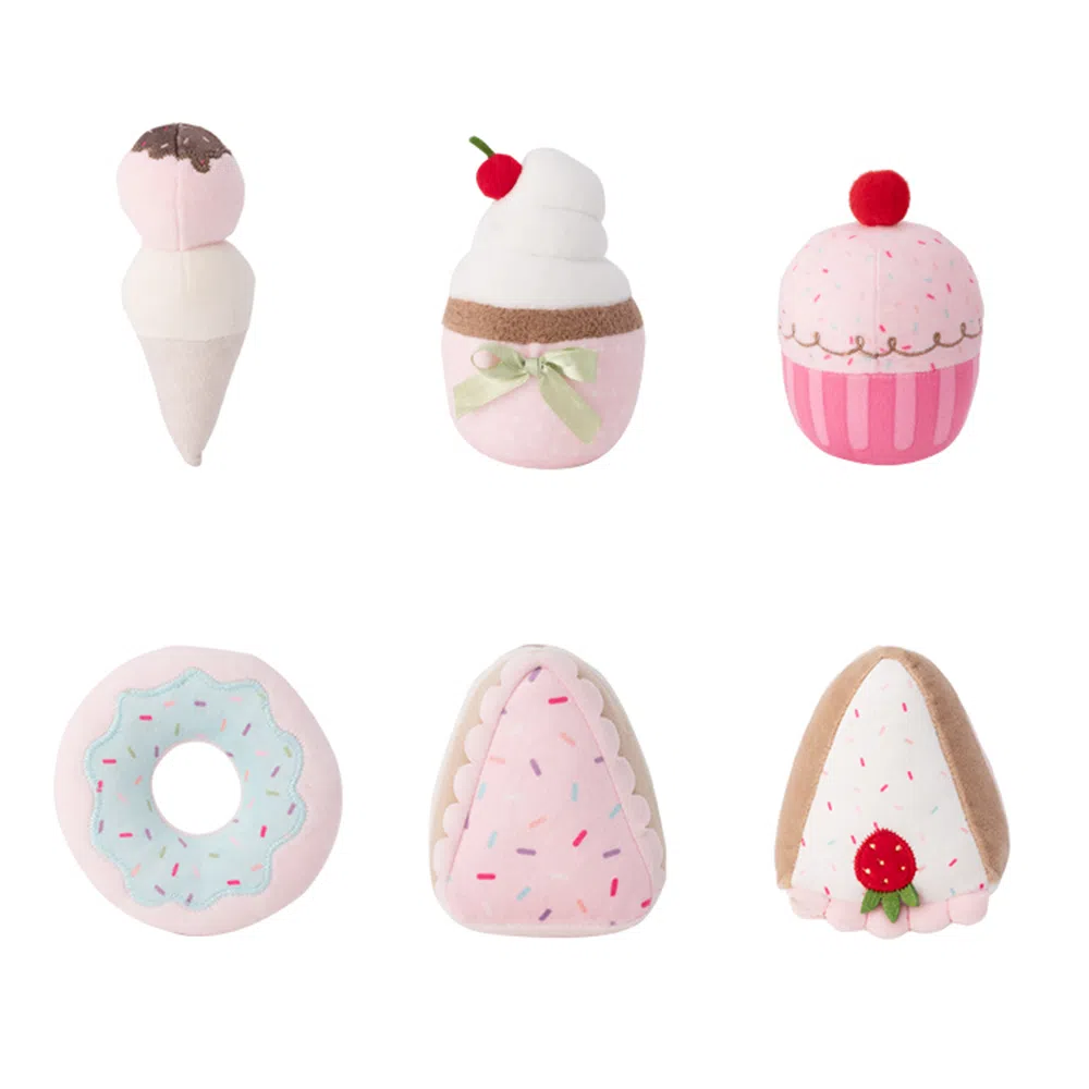 - Pelúcias sendo Bolo 1 de 9,5 x 6 cm; Bolo 2 de 10 x 6 cm; Cupcake 1 de 8 x 10,5 cm; Cupcake 2 de 6 x 8 cm; Sorvete 4,5 x 12 cm e Donuts 10 x 2,5 cm;